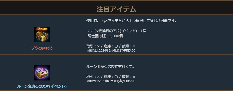 ※一部アイテムは未使用の場合、一定期間が経過すると自動で削除されます。詳しくは各アイテムの詳細をご確認ください。
