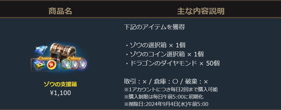 「ドラゴンのダイヤモンド」50個と「ゾウの選択箱」1個、「ゾウのコイン選択箱」1個がセットになった毎日2回購入可能なお得なパッケージです。