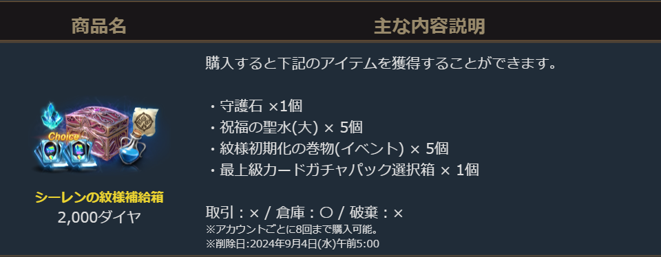 「守護石」1個と「祝福の聖水(大)」5個、「紋様初期化の巻物(イベント)」5個、「最上級カードガチャパック選択箱」1個がセットになったパッケージです。