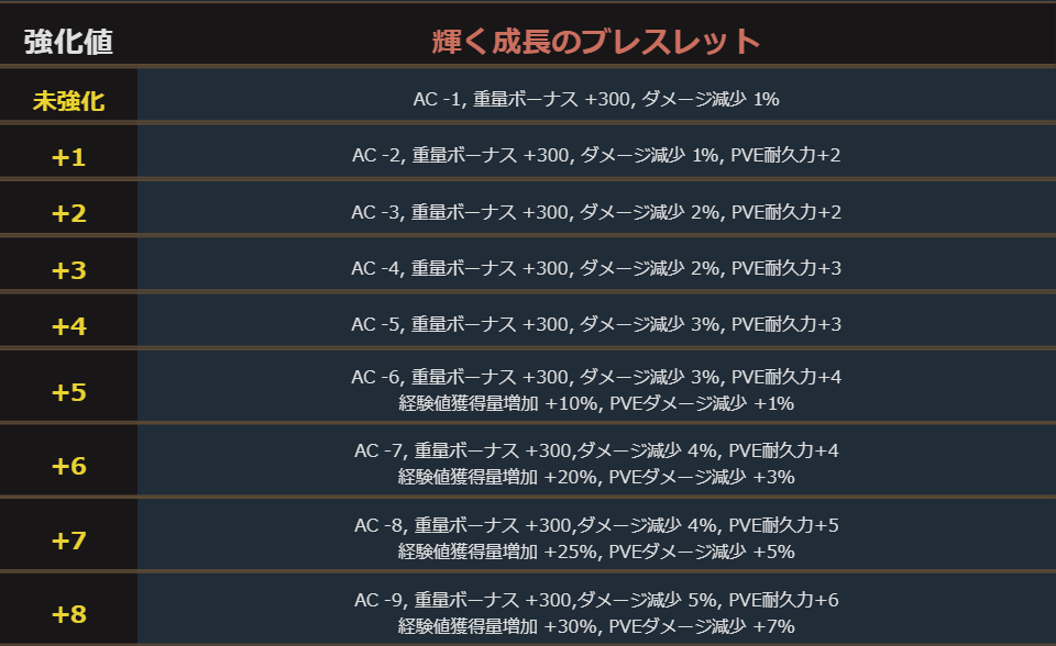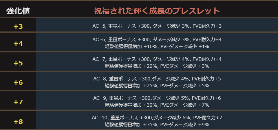 「輝く成長のブレスレット」は装着すると物理防御力(AC)の上昇とダメージ減少効果の発動に加え、+4まで強化し祝福を付与すると経験値獲得量増加の効果も発動します。