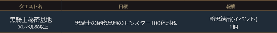 期間中、レベル68以上のキャラクターが入場できるイベントダンジョン「黒騎士の秘密基地」が登場。