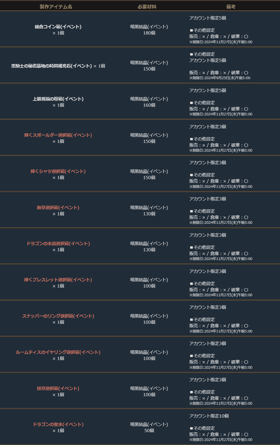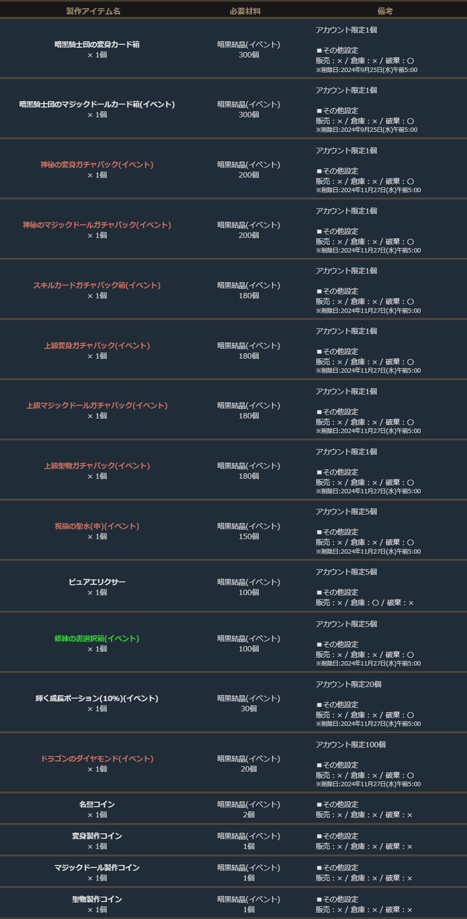クエストと合わせて「暗黒結晶(イベント)」を集めてイベント専用の製作を行い、アイテムを獲得しましょう!