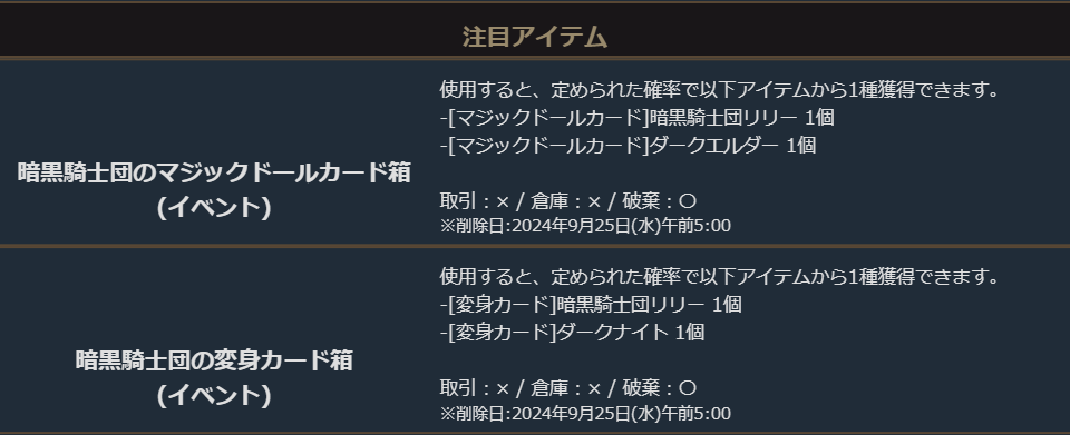 ※一部アイテムが期間終了後も未使用の場合、一定期間が経過すると自動で削除されます。詳しくは各アイテムの詳細をご確認ください。
