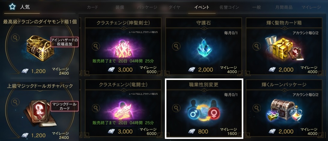 STEP.1 メニュー > ショップ > イベントより、「職業性別変更」を選択してください。