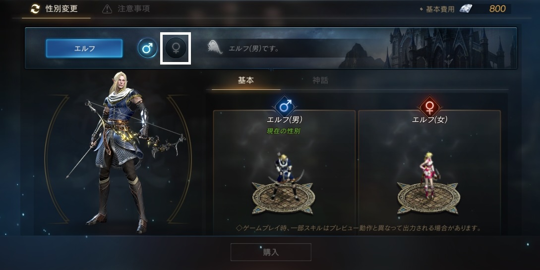 下記の手順の説明にて使用する環境は「エルフ(男性)」→「エルフ(女性)」の場合になっております。