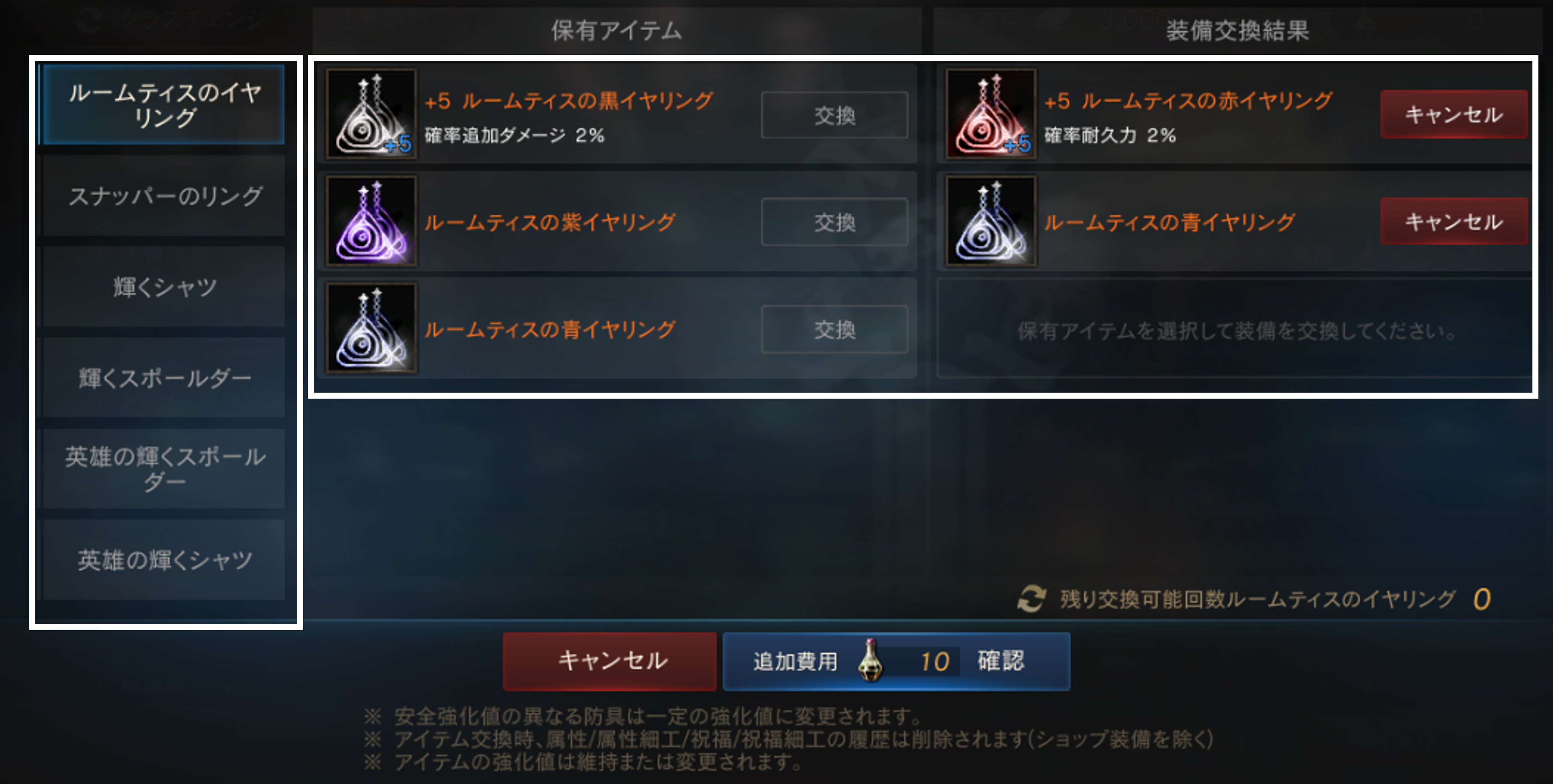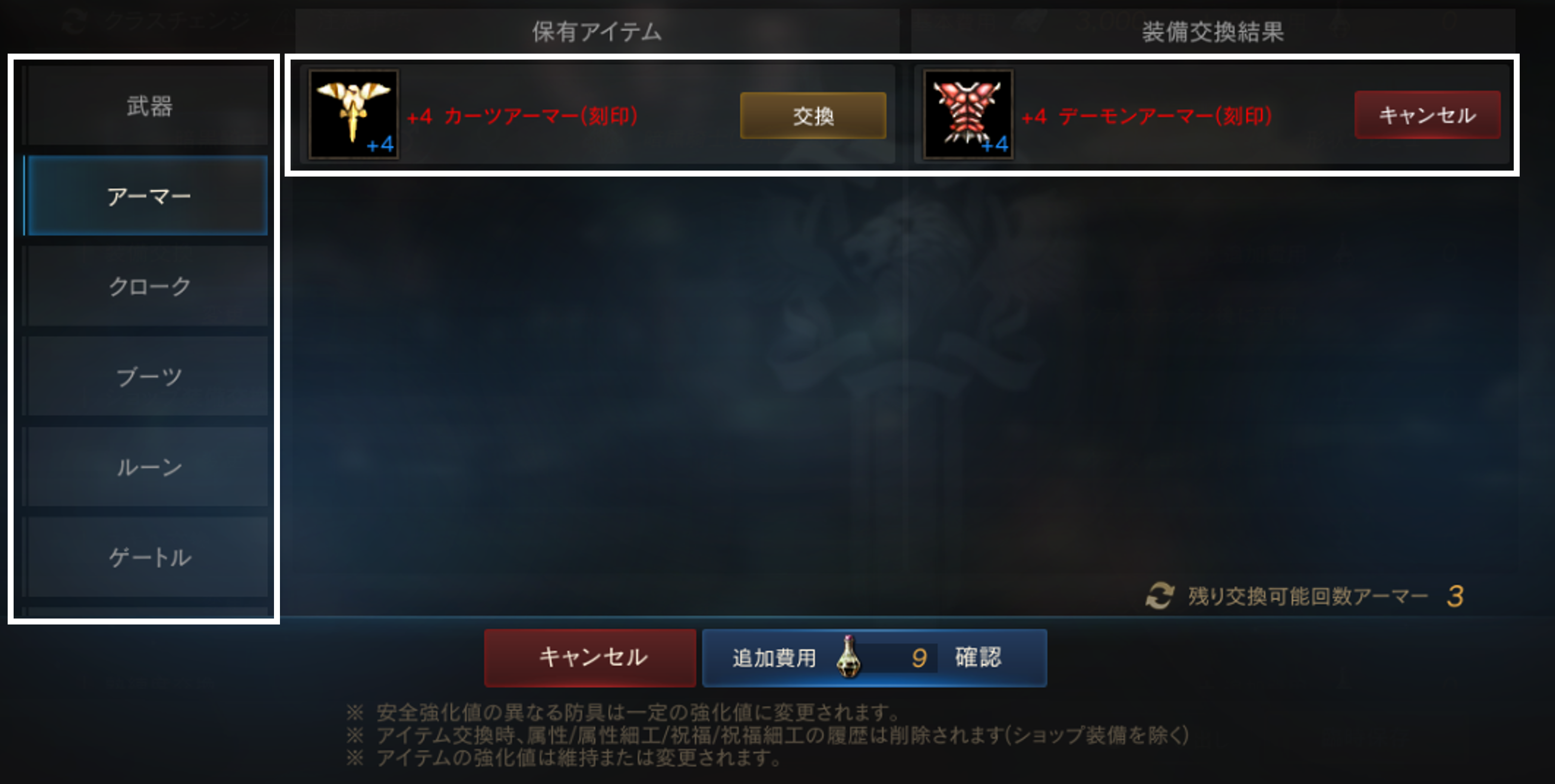 クラスチェンジを行う際に交換可能なアイテムは、希少級以上のクラスチェンジ前のキャラクターが装備可能なアイテムが対象となります。