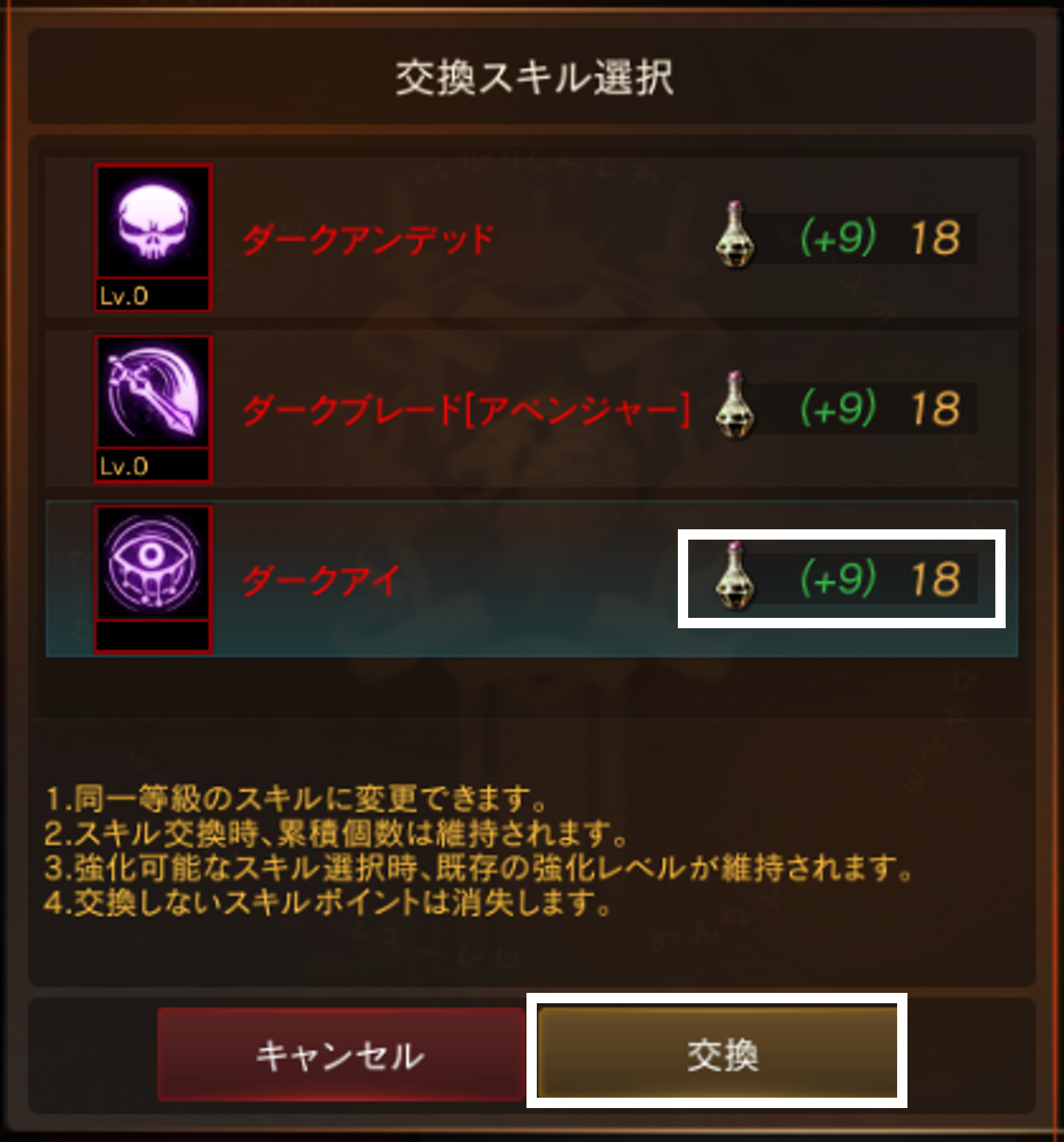 STEP.5 スキル交換で、習得済みスキルに応じた各等級のスキルを選択し、「暗黒騎士」のスキルと交換してください。