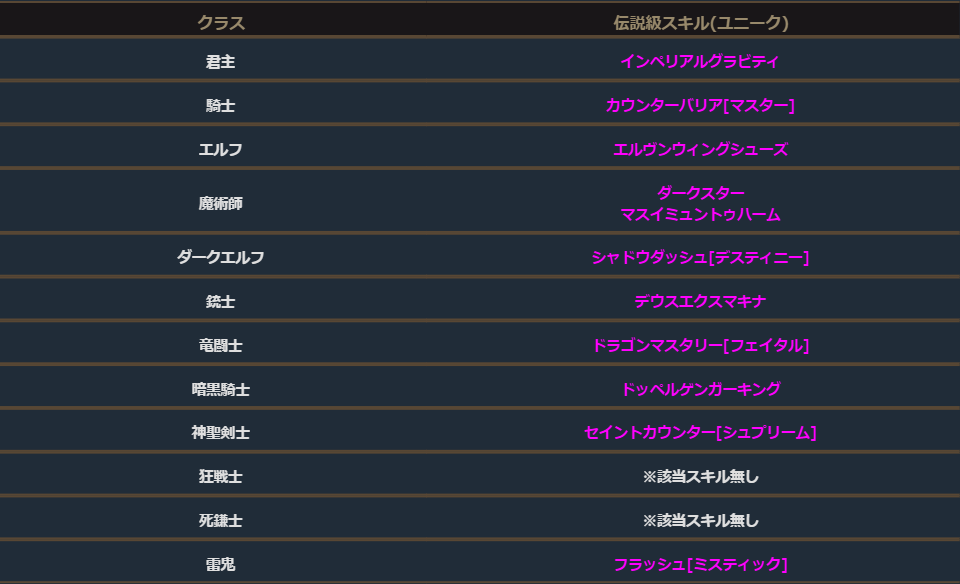 「伝説級スキル(ユニーク)」同士でのみ交換可能なスキルとなっており、各職業の「伝説級スキル(ユニーク)」スキルは以下の通りとなります。
