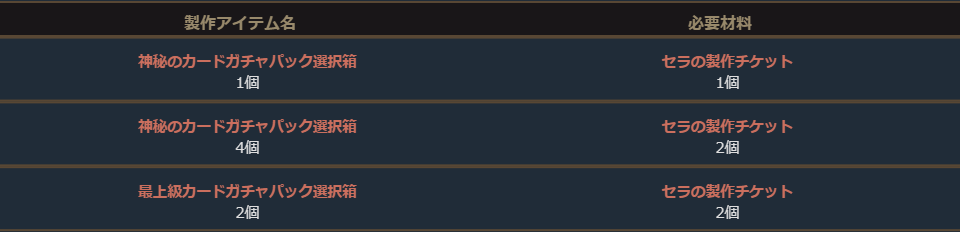 パッケージに付属されている「セラの製作チケット」を使用することで下記のアイテムを製作することが出来ます。