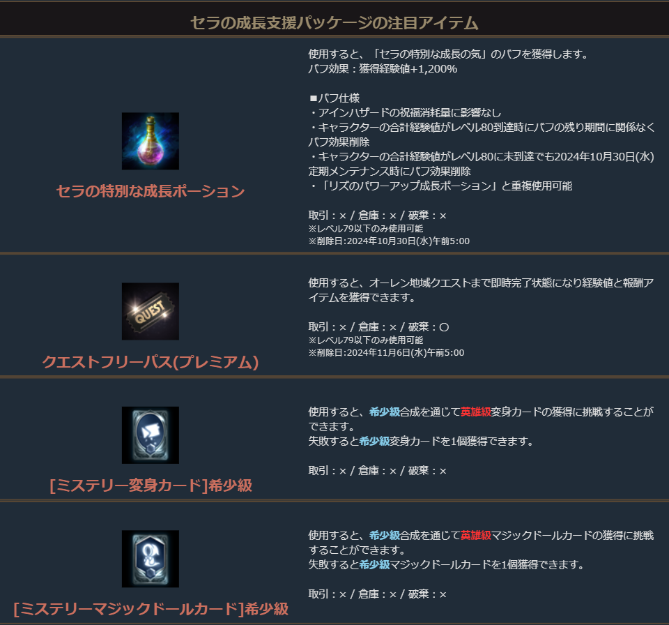 レベル79以下で使用可能な経験値が増加する「セラの特別な成長ポーション」や、特定地域までのメインクエストを一気に完了させる「クエストフリーパス」など、新たにキャラクターを育成する方にお勧めなアイテムです。