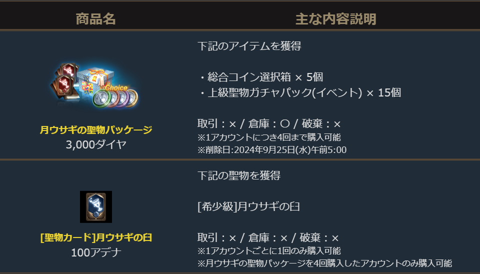 さらに「月ウサギの聖物パッケージ」を4回購入することでアカウントごとに1回のみ「[聖物カード]月ウサギの臼」が購入可能になります。
