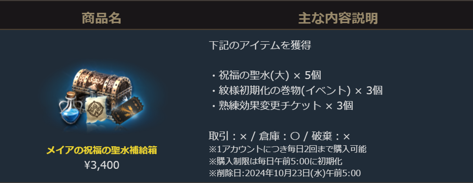 ■「メイアの祝福の聖水補給箱」の販売を開始しました。