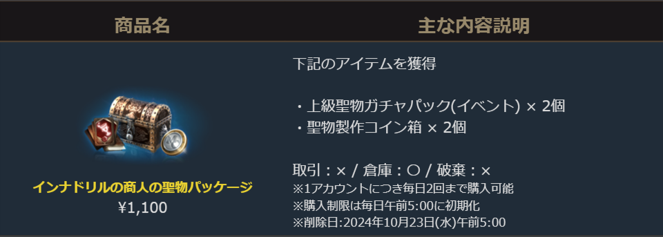 ■「インナドリルの商人の聖物パッケージ」の販売を開始しました。