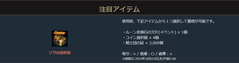 ※一部アイテムは未使用の場合、一定期間が経過すると自動で削除されます。詳しくは各アイテムの詳細をご確認ください。