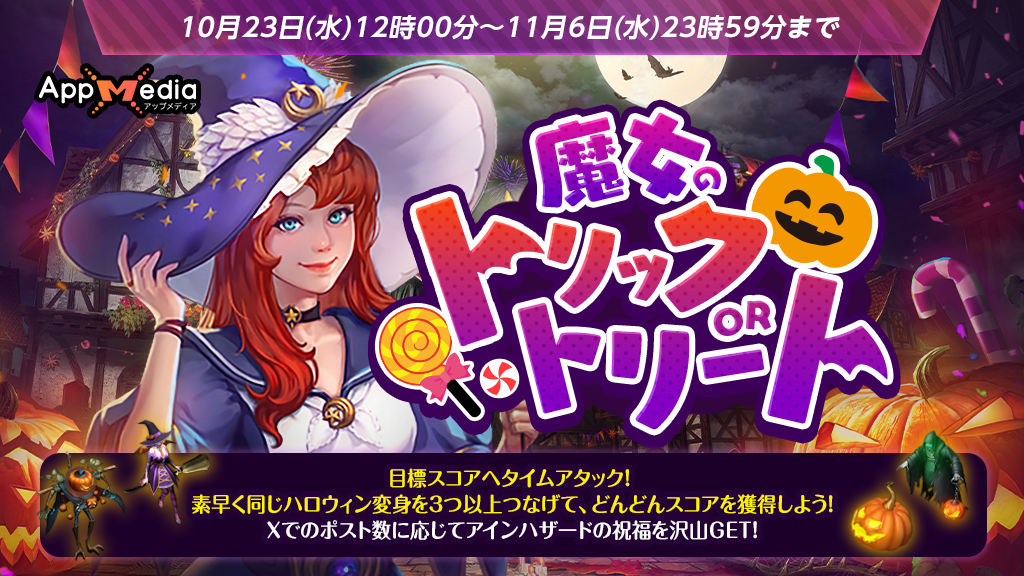 2024年10月23日(水)より攻略wiki「AppMedia」とのコラボレーションイベントとして「魔女のトリックORトリート」を開催いたします。