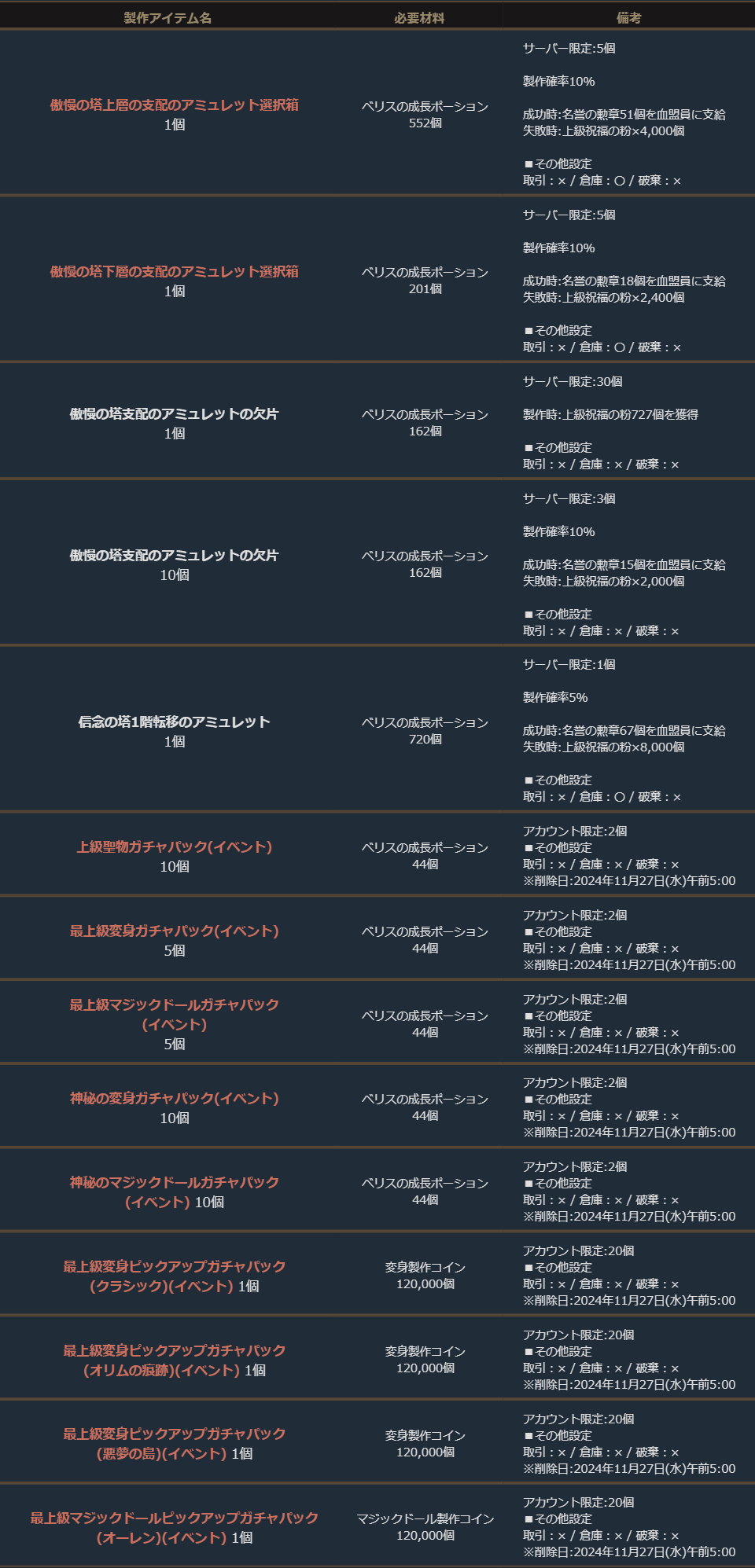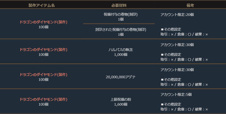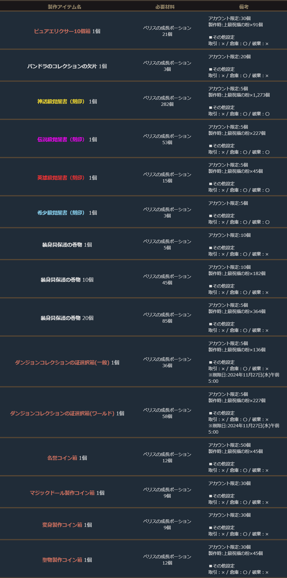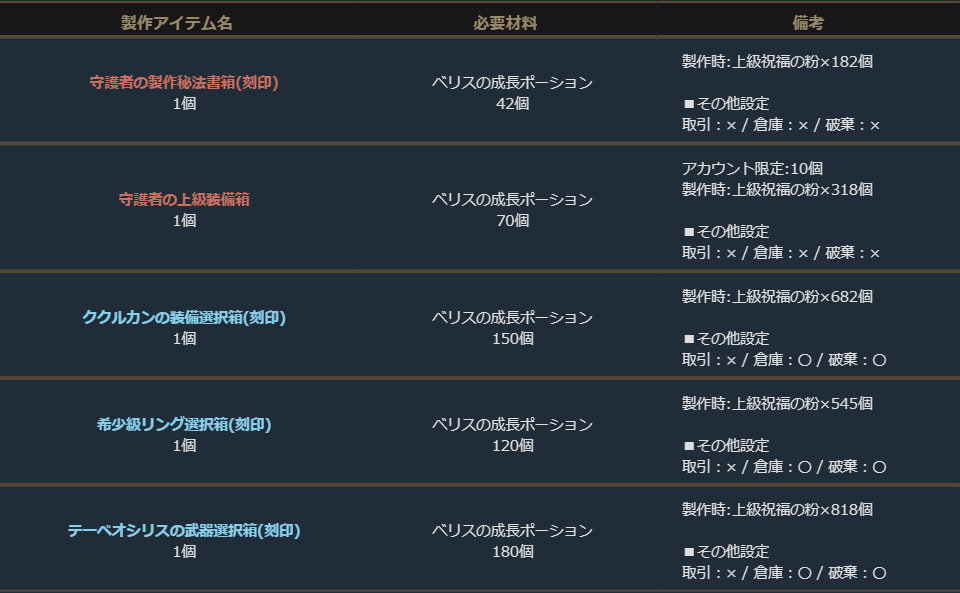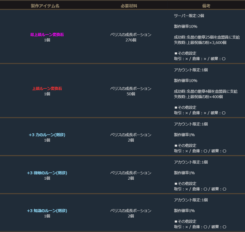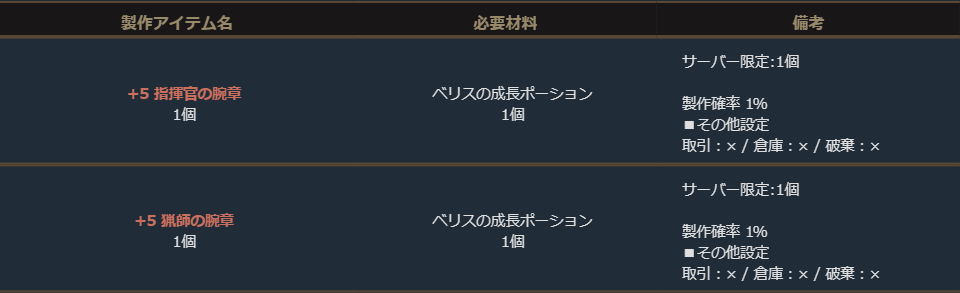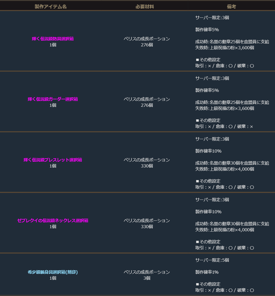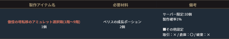 ※サーバー数量限定の製作アイテムは、各サーバーで製作できる数量に上限があります。