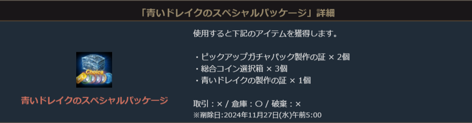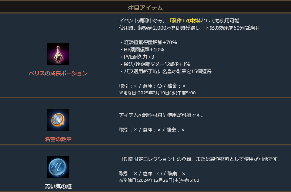 ※一部アイテムは未使用の場合、一定期間が経過すると自動で削除されます。詳しくは各アイテムの詳細をご確認ください。