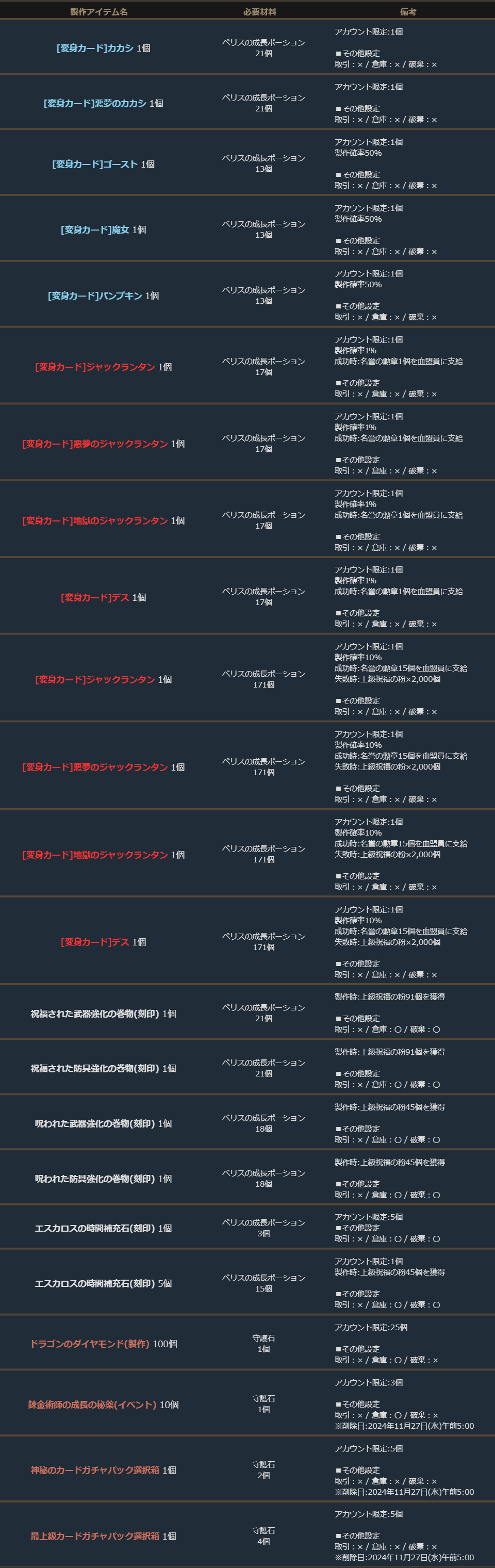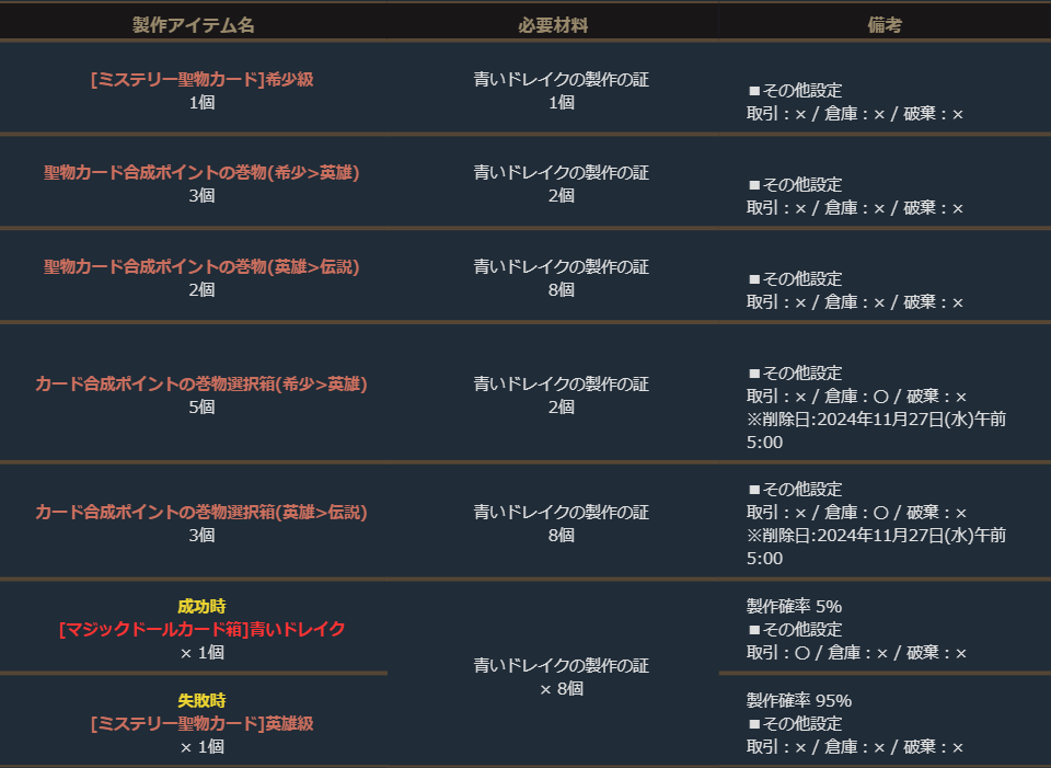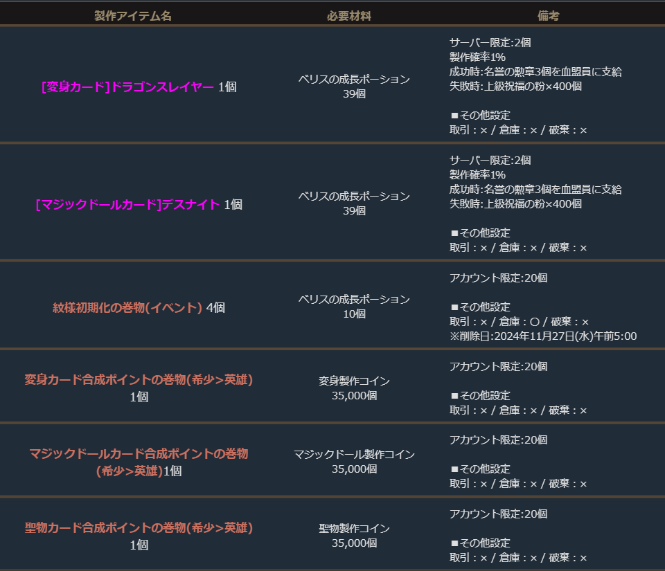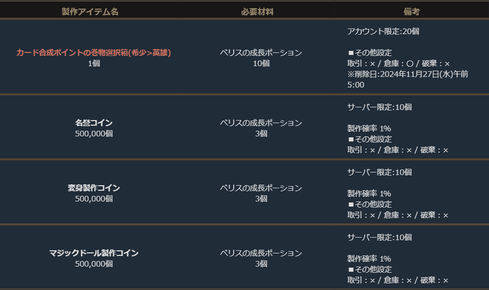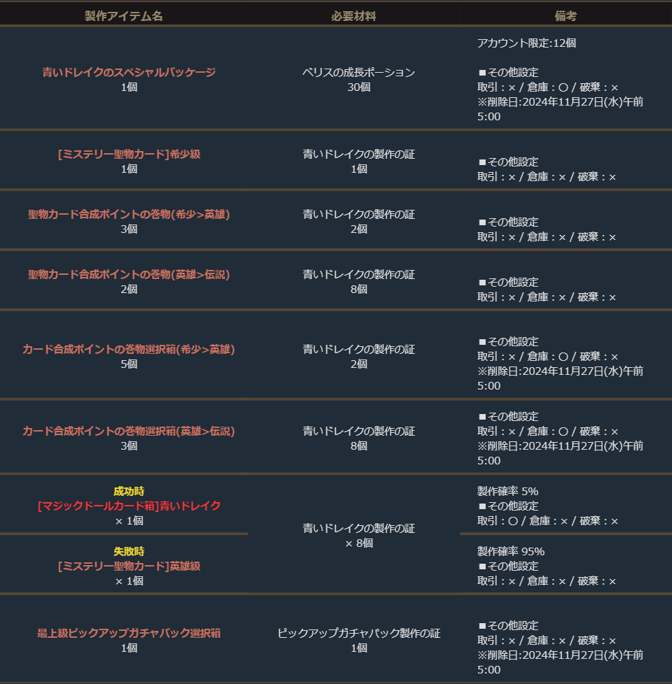 ※期間限定の製作アイテムは、製作可能期間のみゲーム内の「製作」より製作することができます。