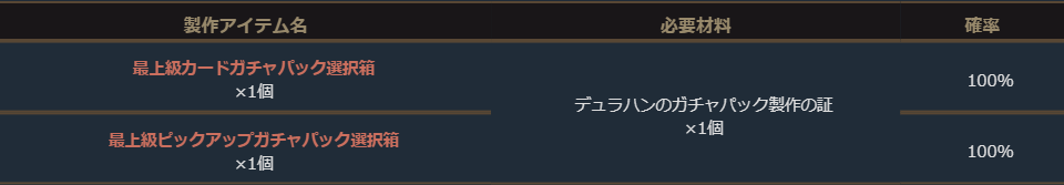さらに、「デュラハンのガチャパック製作の証」では「最上級カードガチャパック選択箱」や「最上級ピックアップガチャパック選択箱」を製作することができます。