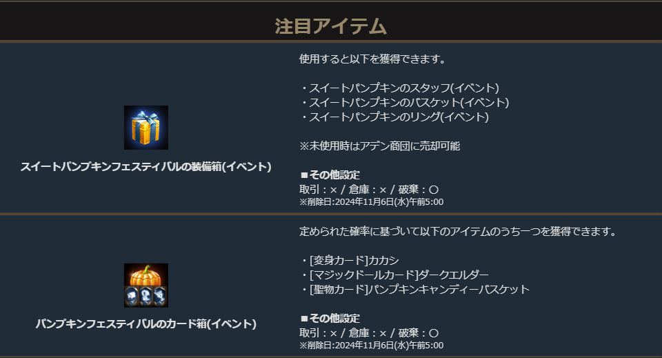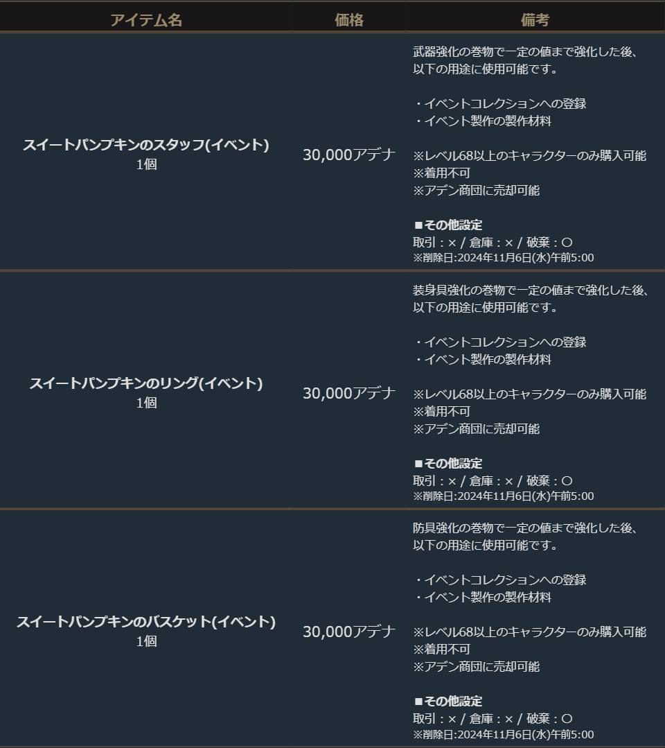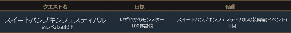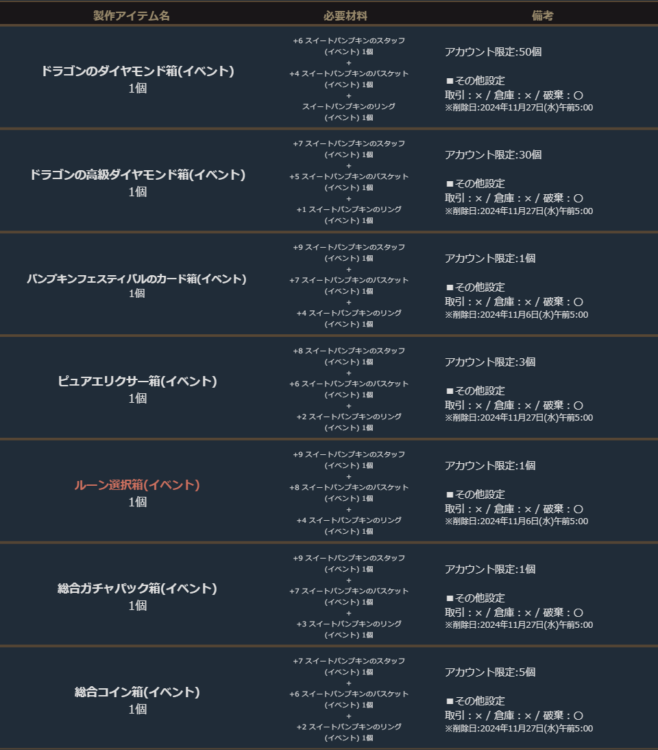 イベント期間中、ゲーム内メニューの「製作>イベント>スイートパンプキンフェスティバル」より、強化したハロウィン装備を材料に各種製作が可能になっています。