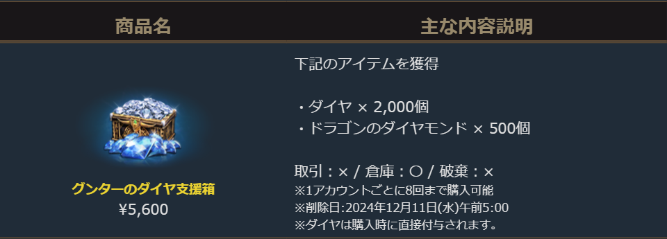 2,000ダイヤと「ドラゴンのダイヤモンド」500個がセットになったお得なパッケージです。