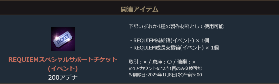 キャンペーン期間中、ゲーム内ショップのイベントタブにて「REQUIEMスペシャルサポートチケット(イベント)」が交換可能となります。