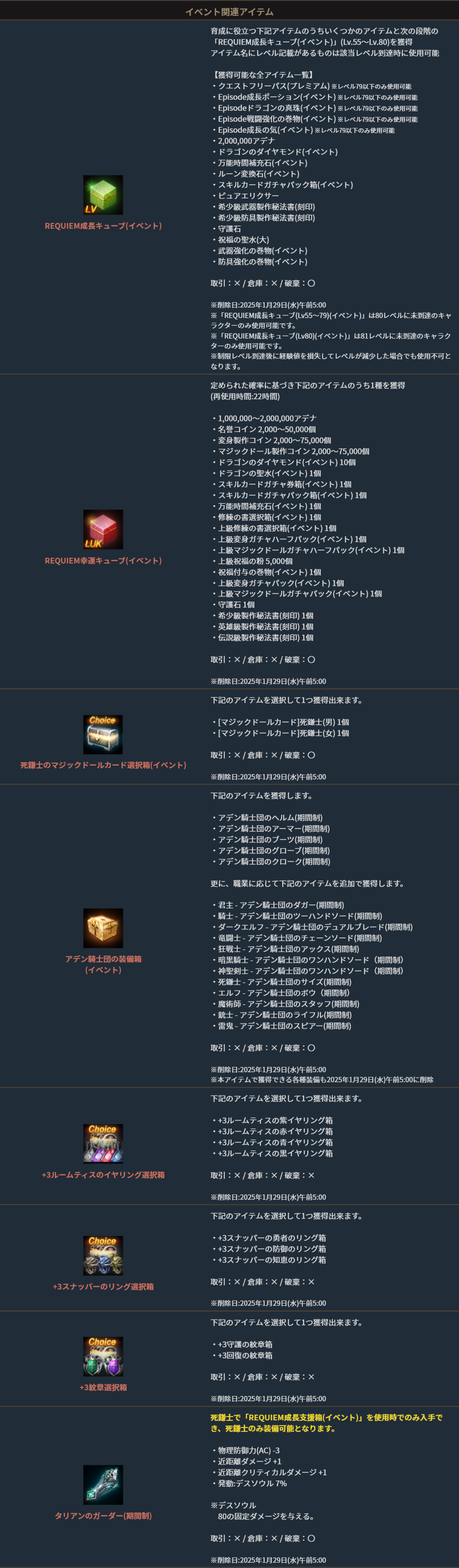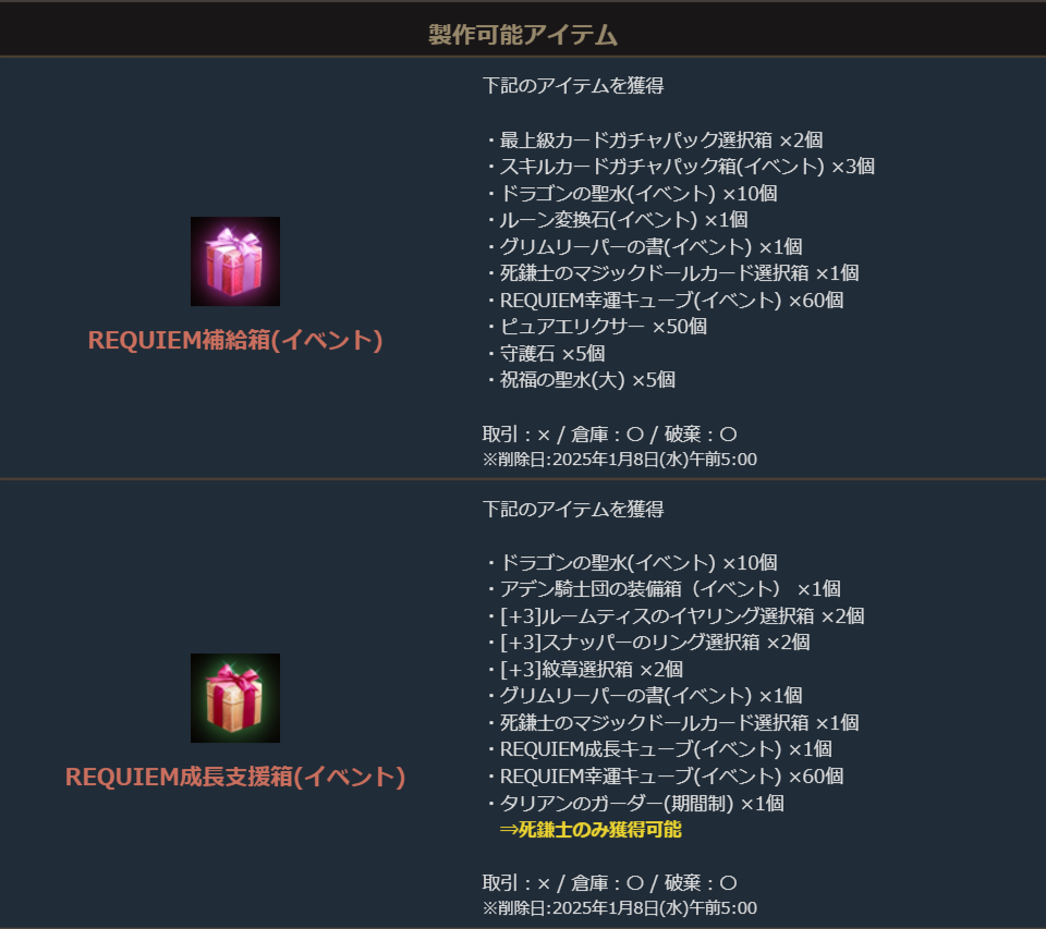 キャンペーン期間中にゲーム内ショップより「REQUIEMスペシャルサポートチケット(イベント)」をアデナで交換する事で製作出来るスペシャルなアイテムをご用意させていただきました。