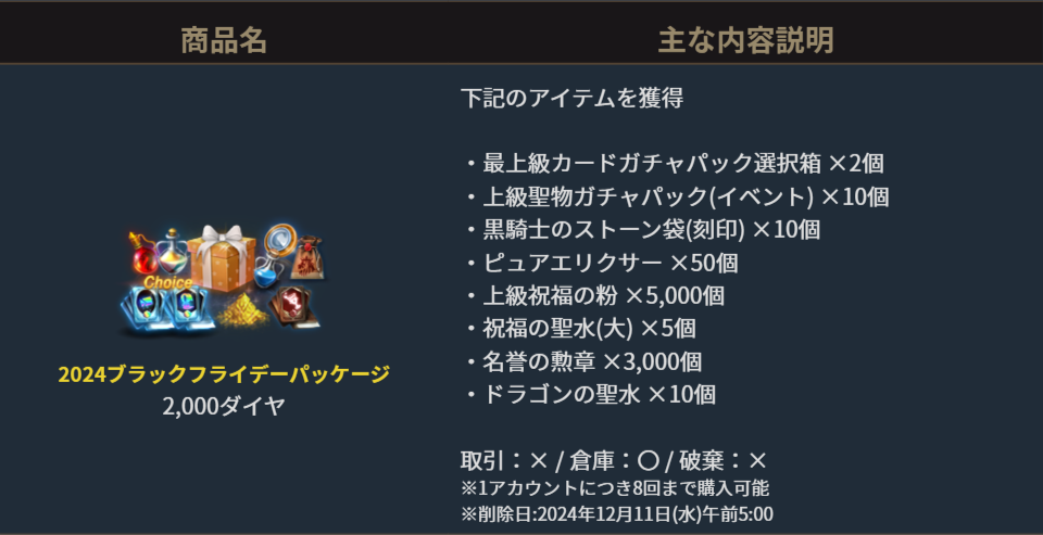「最上級カードガチャパック選択箱」2個と「上級聖物ガチャパック(イベント)」10個や「黒騎士のストーン袋(刻印)」10個をはじめとした様々なアイテムがセットになったお得なパッケージです。