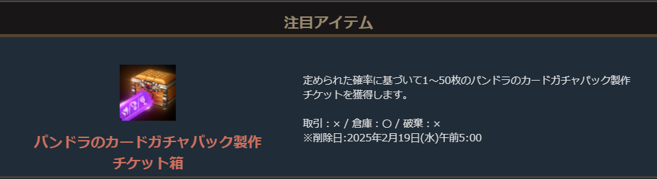 さらに、「パンドラのカードガチャパック製作チケット箱」から1~50枚獲得できる「パンドラのカードガチャパック製作チケット」では「最上級ピックアップパック選択箱」や「神秘の聖物ガチャパック(イベント)」を製作することができます。