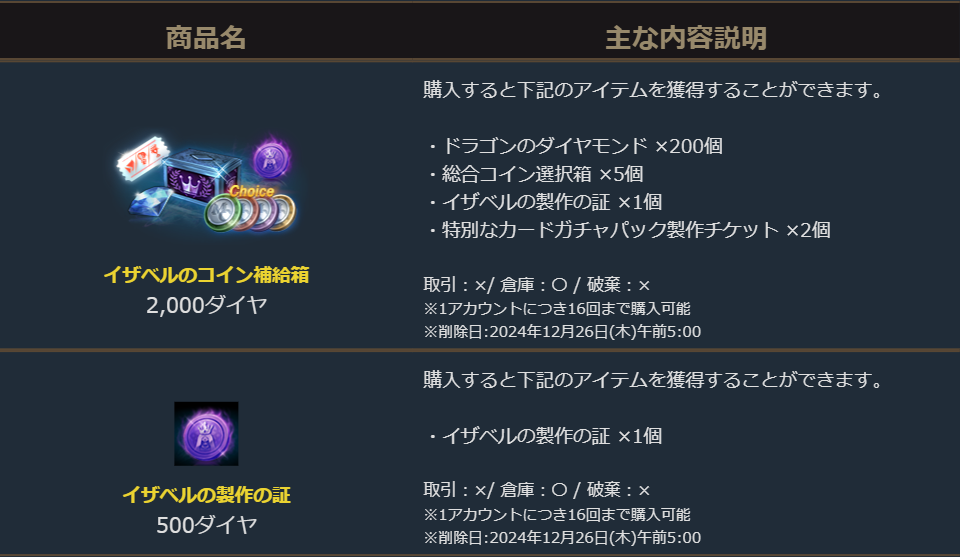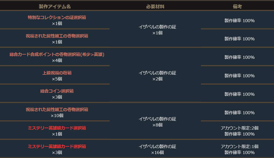さらに、「特別なカードガチャパック製作チケット」では「最上級カードガチャパック選択箱」や「最上級ピックアップパック選択箱」等の製作、「イザベルの製作の証」では「ミステリー英雄級カード選択箱」の製作にチャレンジすることができます。