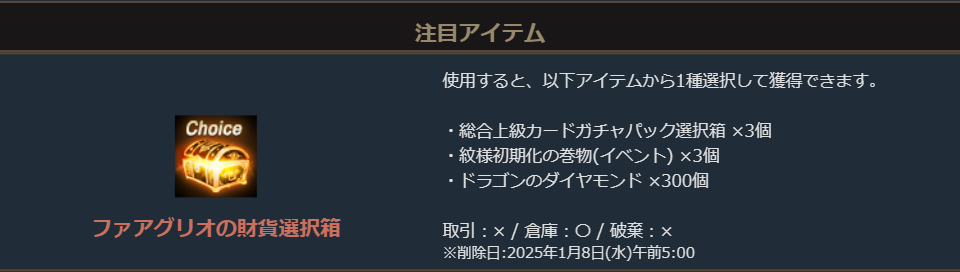 ※一部アイテムは未使用の場合、一定期間が経過すると自動で削除されます。詳しくは各アイテムの詳細をご確認ください。