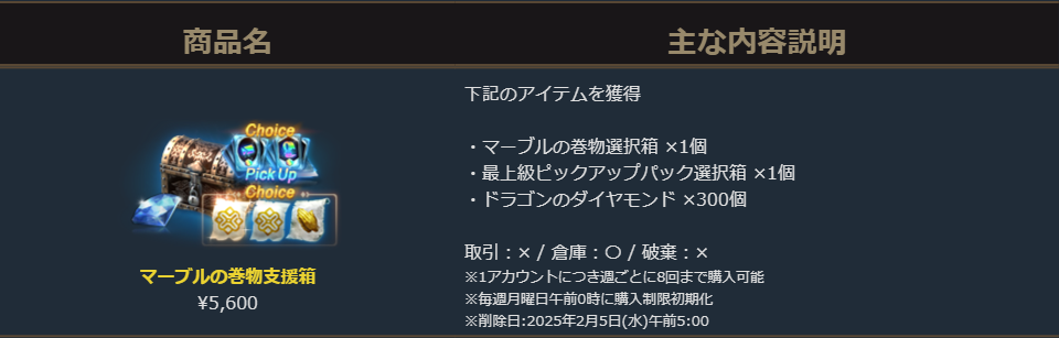 「マーブルの巻物選択箱」1個に加えて「最上級ピックアップパック選択箱」1個と「ドラゴンのダイヤモンド」300個が獲得できます。