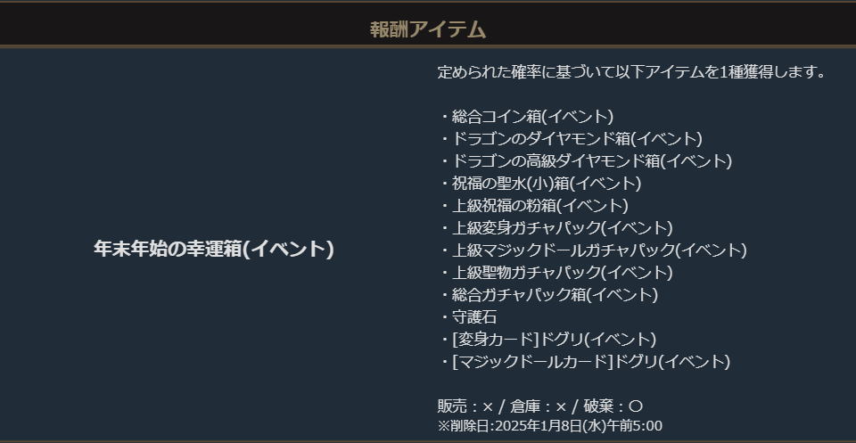 「年末年始の幸運箱(イベント)」は定められた確率に基づいて様々なアイテムを手に入れることができます。