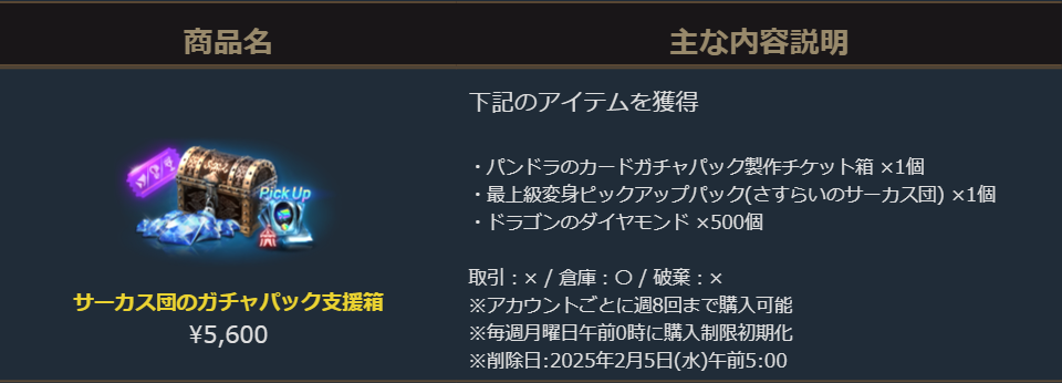 「最上級変身ピックアップパック(さすらいのサーカス団)」1個、「パンドラのカードガチャパック製作チケット箱」1個、「ドラゴンのダイヤモンド」500個がセットになったパッケージです。