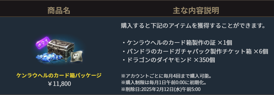 「ケンラウヘルのカード箱製作の証」1個と「パンドラのカードガチャパック製作チケット箱」6個が獲得でき「ドラゴンのダイヤモンド」が350個も獲得が出来るお得なパッケージです。