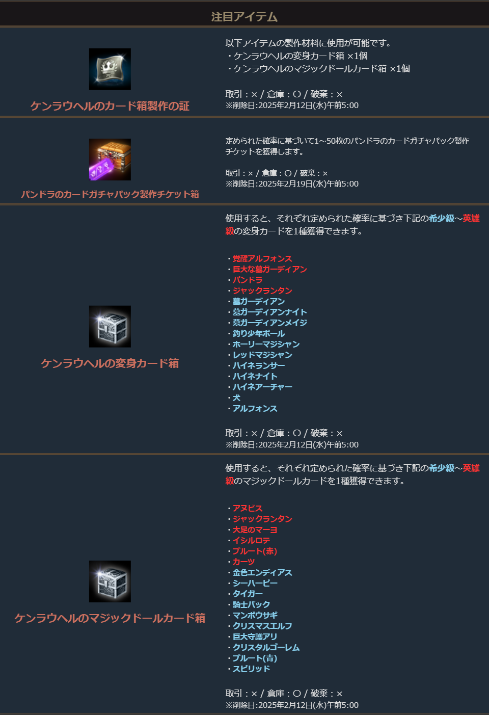 ※一部アイテムは未使用の場合、一定期間が経過すると自動で削除されます。詳しくは各アイテムの詳細をご確認ください。