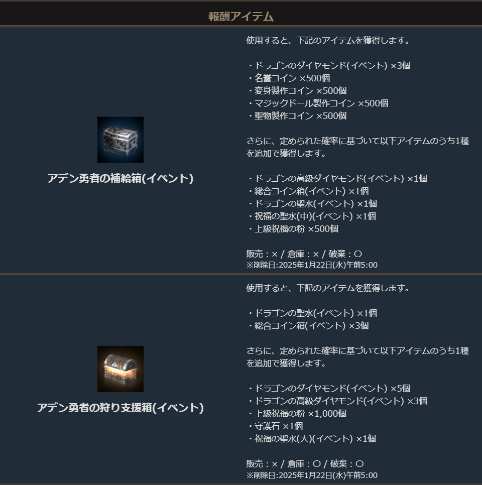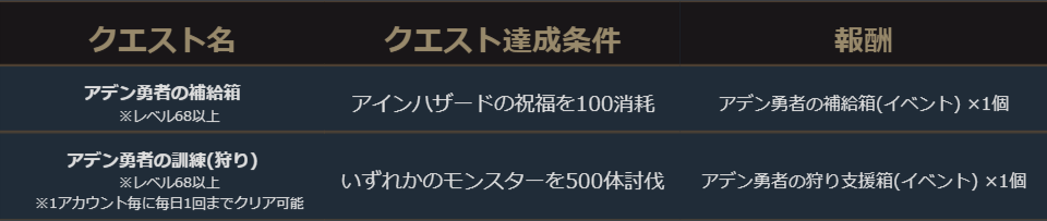 それぞれ達成する事で、報酬として「アデン勇者の補給箱(イベント)」と「アデン勇者の狩り支援箱(イベント)」を獲得する事ができます。