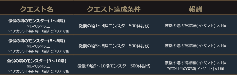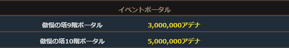 ・イベント期間中「傲慢の塔と信念の塔入り口」のマップに「傲慢の塔9階ポータル」と「傲慢の塔10階ポータル」が設置され入場がしやすくなります。