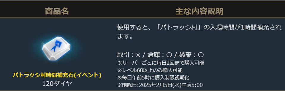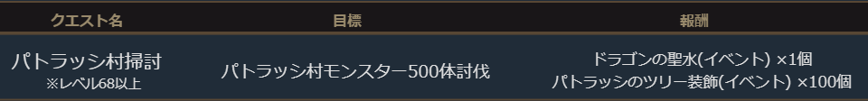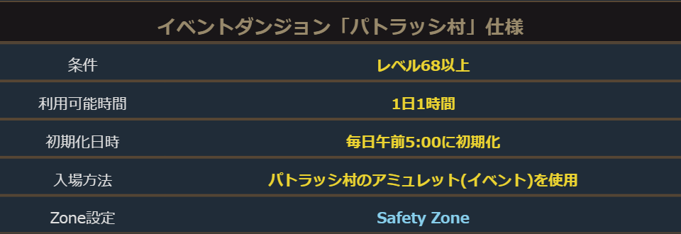 「パトラッシ村」はレベル68以上のキャラクターが入場できるダンジョンになっています。