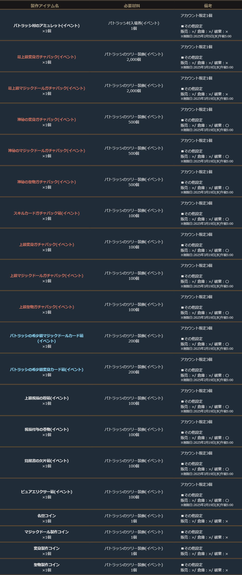 ※「パトラッシ村のアミュレット(イベント)」は別のキャラクターに移動させることができませんので製作するキャラクターにご注意ください。