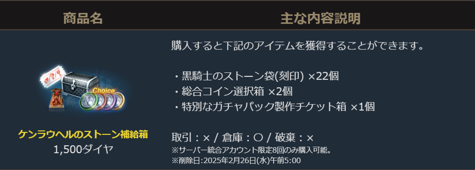 「黒騎士のストーン袋(刻印)」22個と「総合コイン選択箱」2個がセットになったお得に「黒騎士のストーン袋(刻印)」を獲得できるパッケージです。