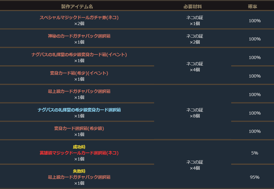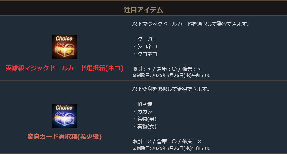 「英雄級マジックドールカード選択箱(ネコ)」では新規追加されたマジックドール「クロネコ」を選択して獲得することができます。