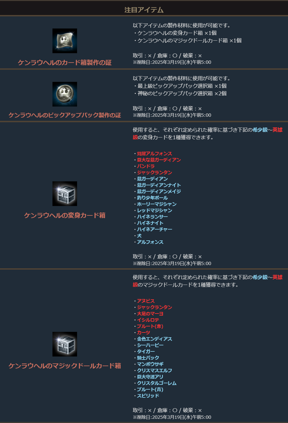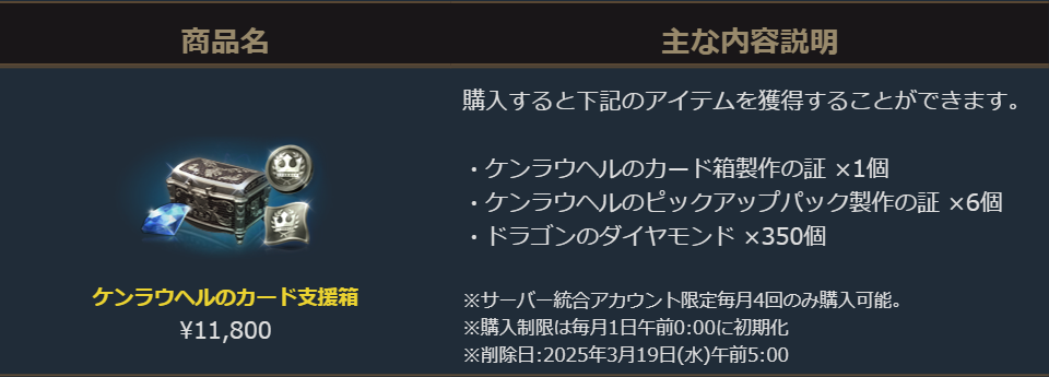 「ケンラウヘルのカード箱製作の証」1個と「ケンラウヘルのピックアップパック製作の証」6個が獲得でき「ドラゴンのダイヤモンド」が350個も獲得が出来るお得なパッケージです。