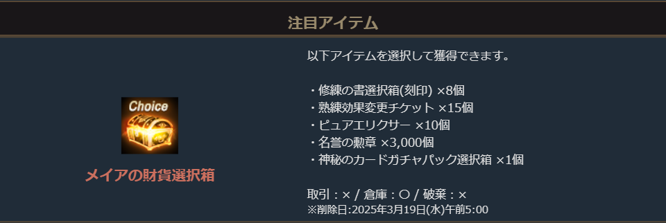 ※一部アイテムは未使用の場合、一定期間が経過すると自動で削除されます。詳しくは各アイテムの詳細をご確認ください。
