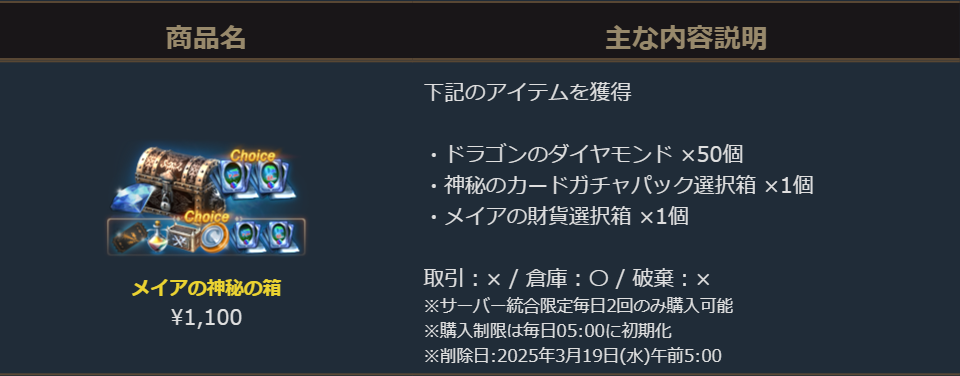 様々なアイテムを獲得できる「メイアの財貨選択箱」1個に加え、「神秘のカードガチャパック選択箱」1個と「ドラゴンのダイヤモンド」50個が獲得できる、毎日2回購入可能なお得なパッケージとなっております。