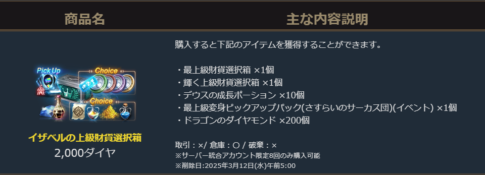 2025年2月26日より販売を開始しました「イザベルの上級財貨選択箱」のご案内を申し上げます。