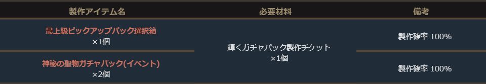 「最上級財貨選択箱」から獲得できる「輝くガチャパック製作チケット」は「最上級ピックアップパック選択箱」や「神秘の聖物ガチャパック(イベント)」の製作が可能です。