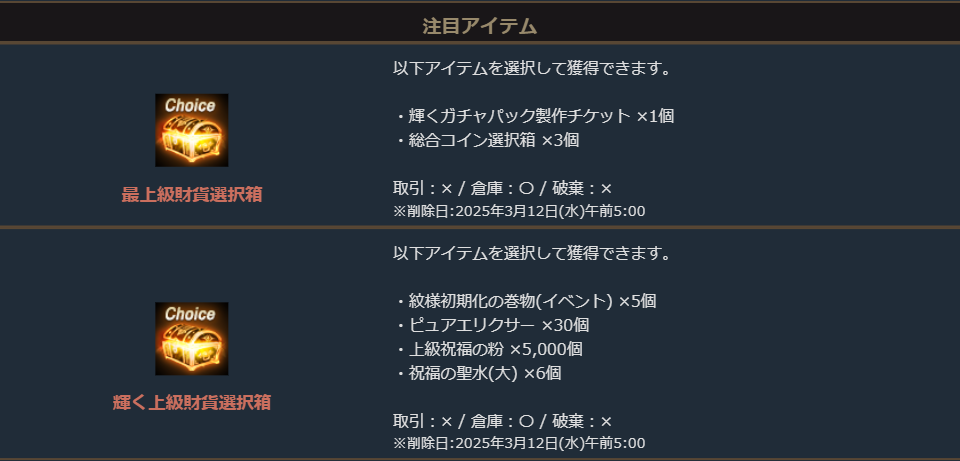 ※一部アイテムは未使用の場合、一定期間が経過すると自動で削除されます。詳しくは各アイテムの詳細をご確認ください。