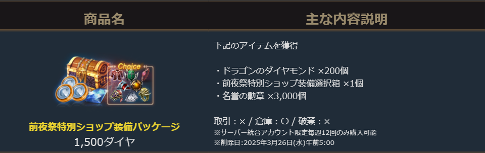 2025年3月5日より販売を開始しました「前夜祭特別ショップ装備パッケージ」のご案内を申し上げます。