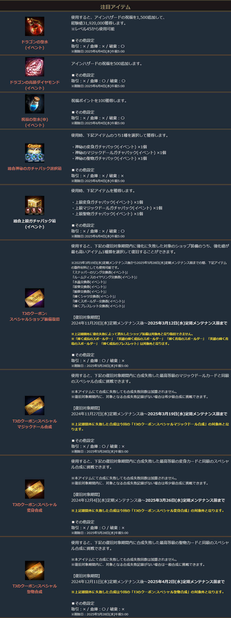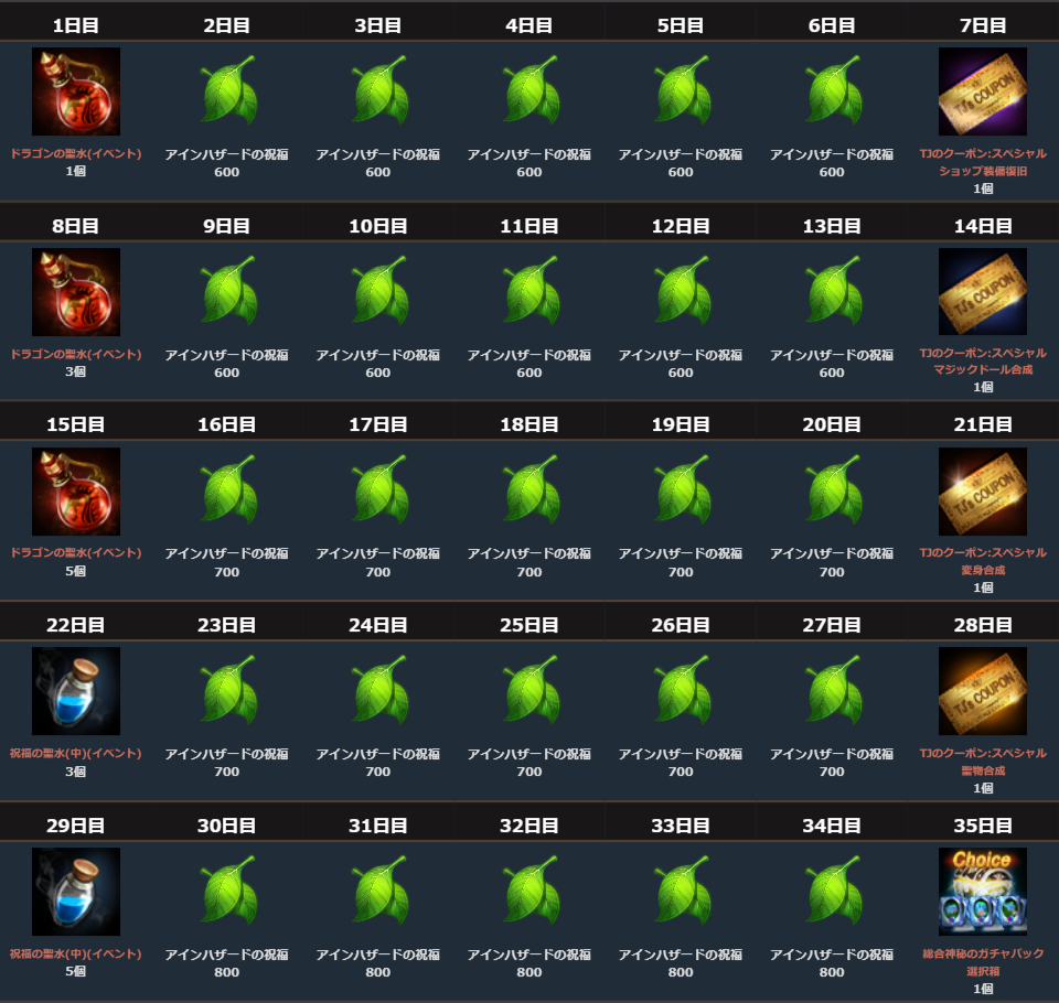 多くのアインハザードの祝福に加え、「ドラゴンの聖水(イベント)」や各種「TJクーポン」が獲得できます。